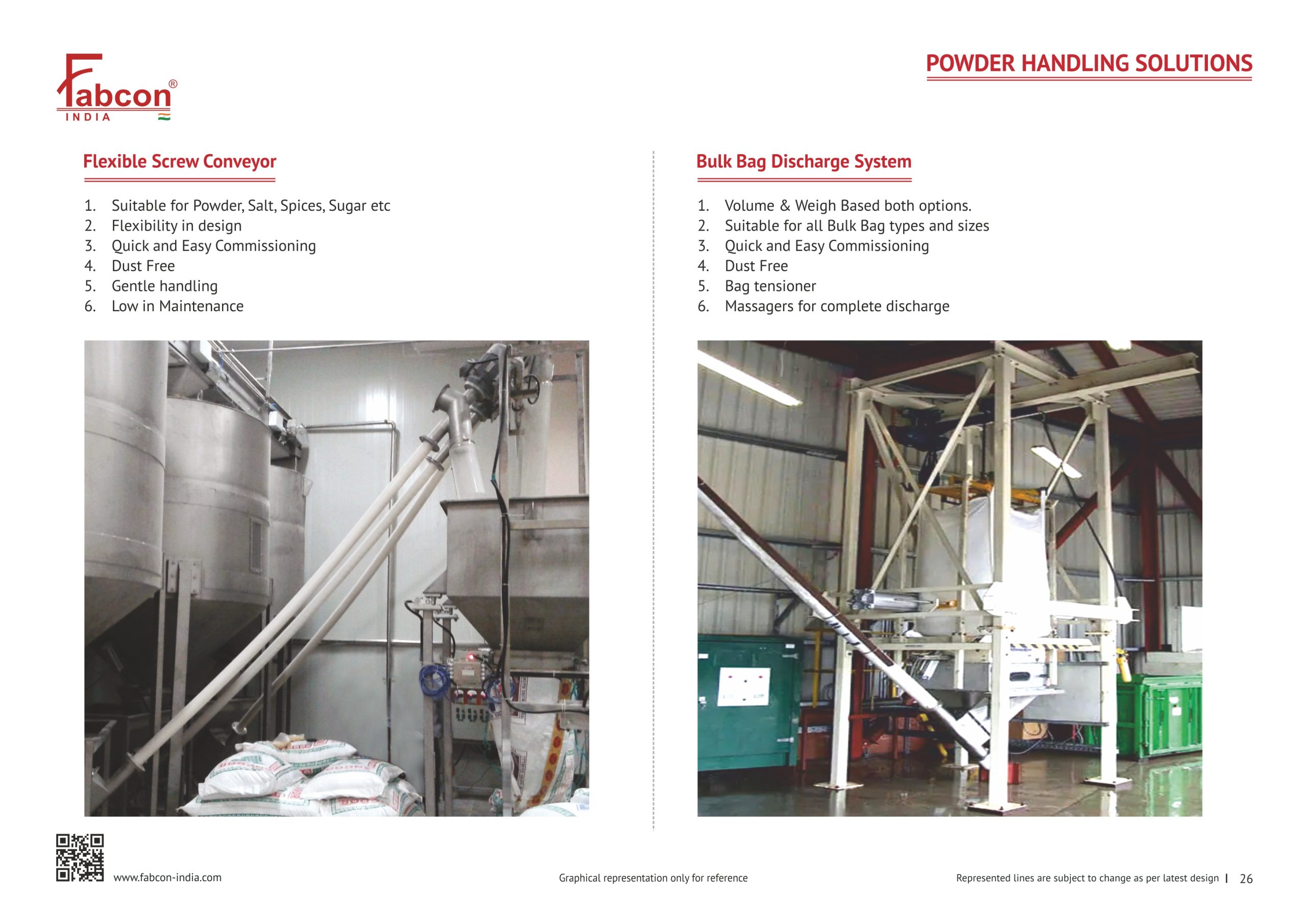 In the food industry, powder handling solutions are essential for efficiently processing and managing various powdered ingredients. These solutions help with tasks such as mixing, blending, conveying, dosing, and packaging of powders. Here are some different kinds of powder handling solutions that Fabcon India offers:
